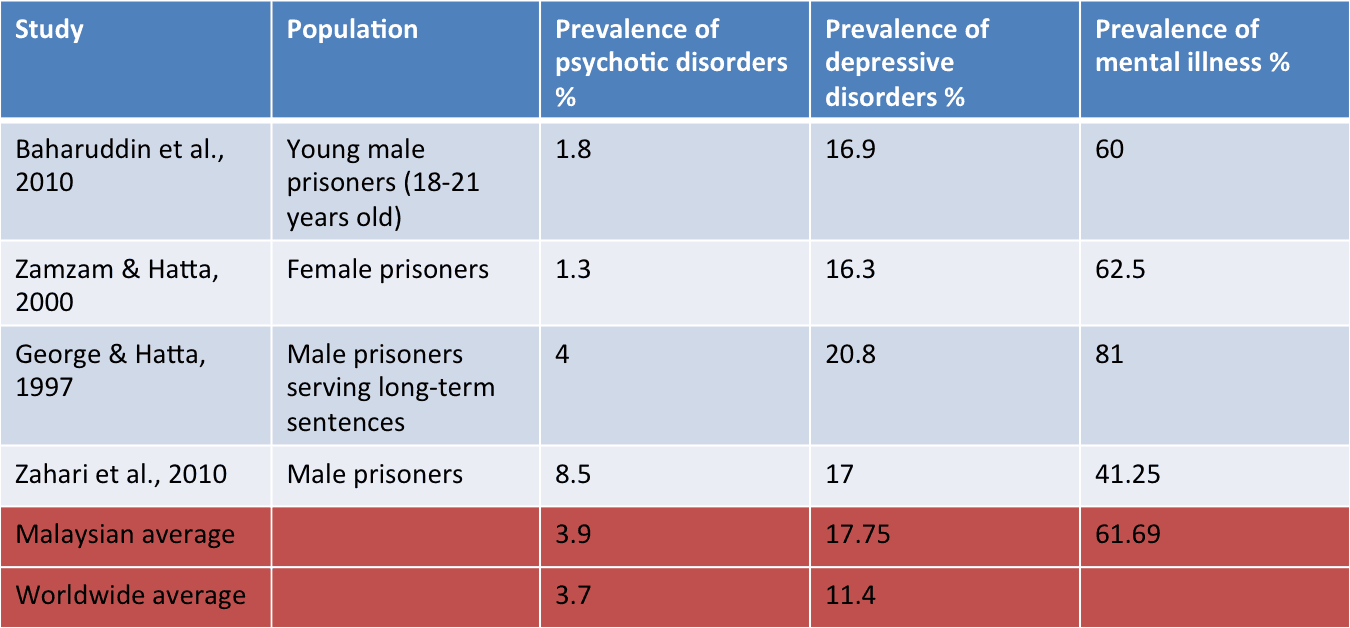 1. There is a higher prevalence for mental illness among the prison population than the general population in Malaysia.