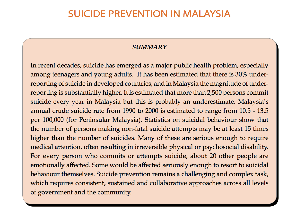 In 2005, the Ministry of Health (MOH) conceded that the rate of suicide is severely underestimated and that the true rate of suicide ranges from 10. 5 – 13.5 people per 100000 (Malaysia Health 2005, p. 162). Below is a screenshot of the summary posted in the report.