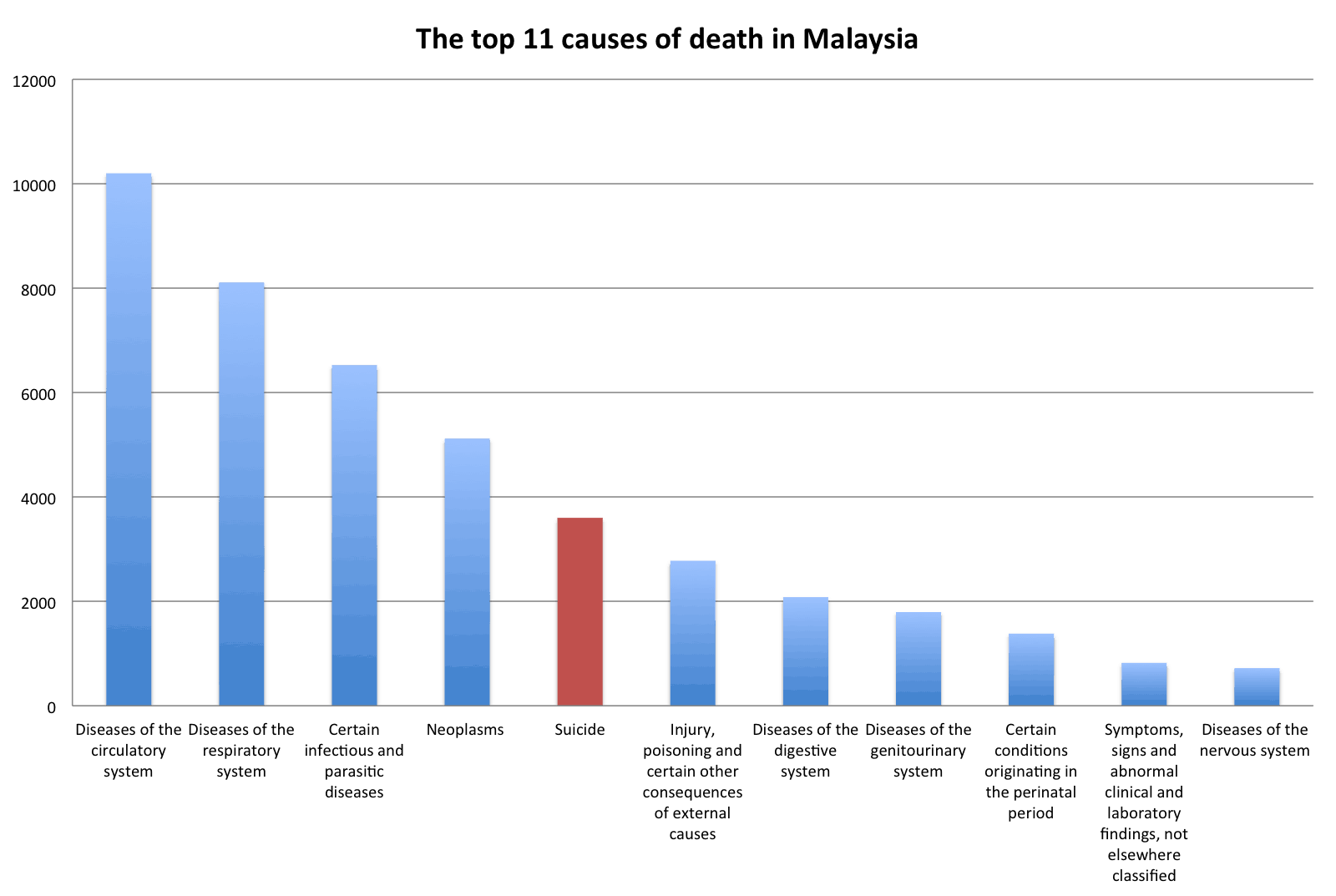 Using data published by MOH, we can extrapolate that suicide is the number 5 cause of death in Malaysia.
